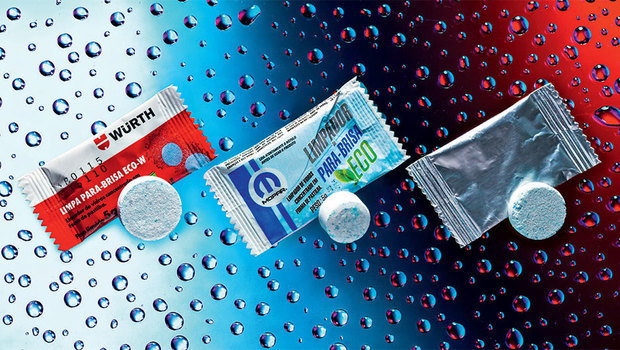 Antes de pegar a estrada, poucos pensam em checar o nível do reservatório do lavador de para-brisa. Menos gente ainda lembra que não basta colocar água, mas também o sabão. Uma boa opção para esses casos é ter no porta-luvas as pastilhas detergentes, que ocupam pouco espaço e não oferecem o risco de vazamento. O teste reuniu três das marcas mais comuns em lojas ou redes de concessionárias: Wurth, Mopar e Scrubblade – as duas primeiras vendidas por unidade e a terceira só em caixa com cinco comprimidos.