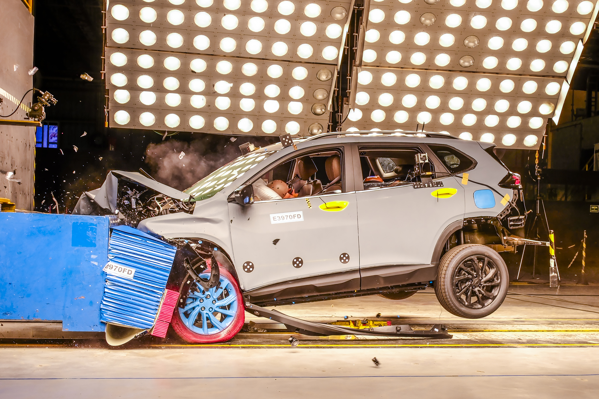 Nesses testes, o veículo colide contra uma barreira deformável, que simula a frente de outro carro. Já em outros testes, como os do instituto americano NHTSA, a barreira pode ser fixa e rígida, como um muro de concreto, apresentando um desafio diferente para a estrutura do automóvel.