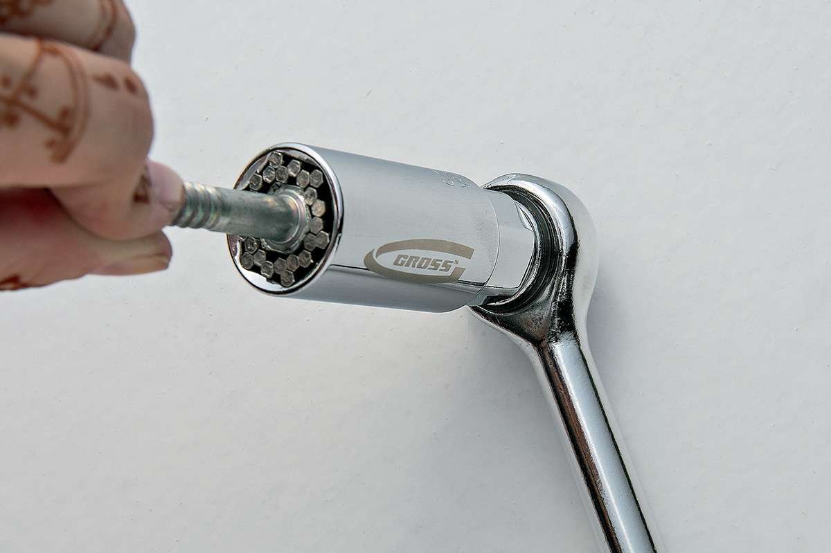 O kit composto por uma catraca e um soquete autoajustável Gross é simples e ao mesmo tempo engenhoso. Compatível com parafusos sextavados de 6 a 21 mm, o soquete tem pequenos pinos (sustentados por molas internas) que se moldam à cabeça de parafusos diferentes. Na teoria, essa ferramenta pode fazer o trabalho de 26 chaves de parafuso tipo canhão, uma para cada medida. Só que na prática a coisa é um pouquinho mais complicada.