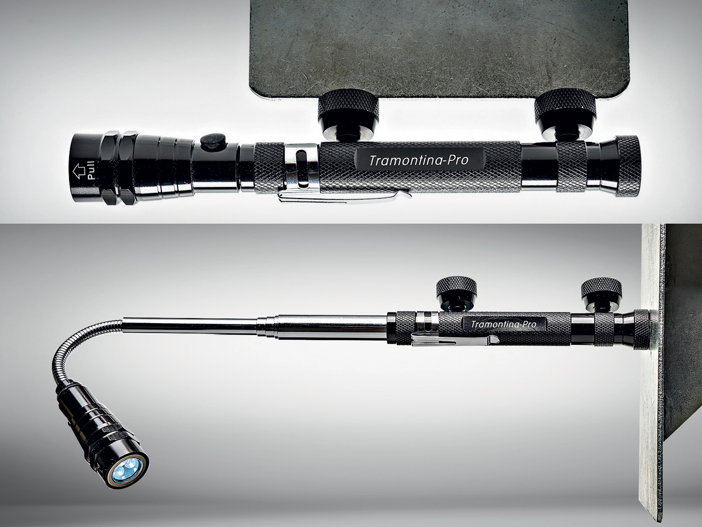 Veja suas qualidades: apesar de compacta (17 cm), alcança 55 cm quando a haste telescópica é esticada; tem um ímã na base e outros dois no corpo, que permitem colocá-la de pé ou na horizontal em qualquer parte da carroceria; traz uma ponta flexível para se esgueirar nos cantos mais escondidos; há outro ímã na ponta iluminada só para pegar peças metálicas em áreas de difícil de acesso.