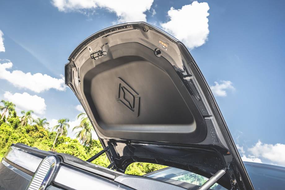 Há algumas surpresas na frente, como a portinhola giratória do lado esquerdo, que se abre eletricamente ao passar o dedo na moldura da caixa de roda revelando o bocal de carregamento. E a abertura elétrica do capô revela um bom porta-malas dianteiro com 311 litros de capacidade – o que seria grande para um hatch compacto. Com drenos, pode virar um cooler.