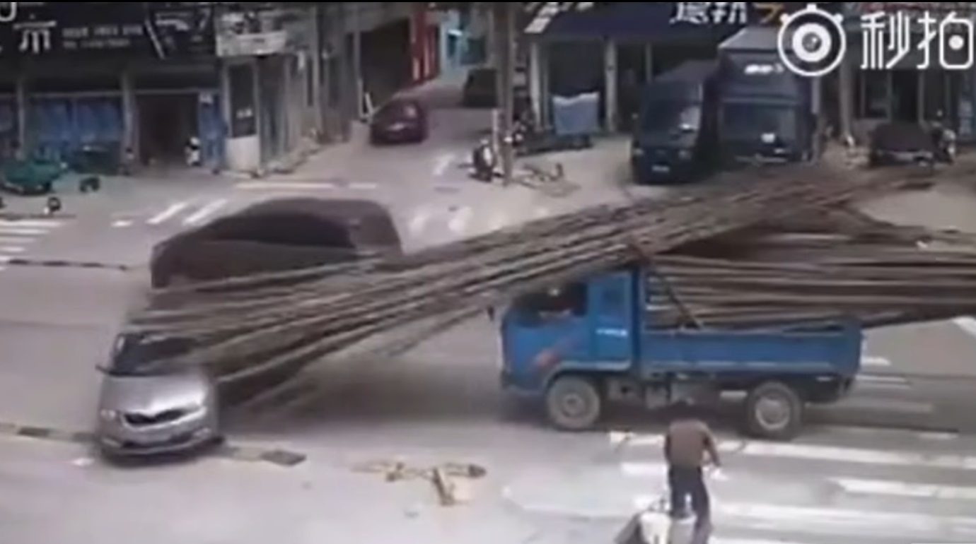 O resultado dessa falta de atenção veio com um caminhão carregado de bambus. O carro simplesmente foi empalado na lateral pelos bambus, que se deslocaram para frente com a freada brusca do caminhão. Após o incidente, uma mulher sai do carro e puxa o homem para fora com ajuda de outras pessoas. Apesar da gravidade, ambos saíram aparentemente ilesos.
