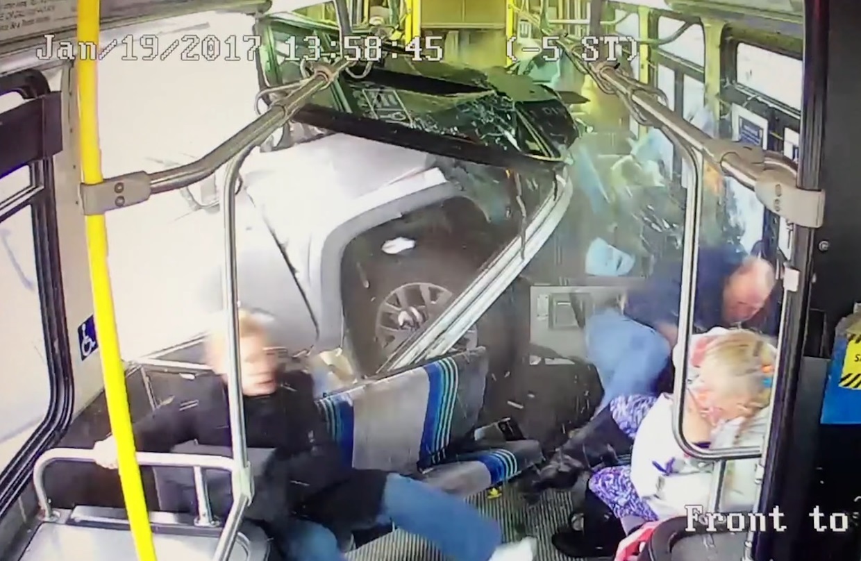 A picape desgovernada atropelou uma placa de sinalização e depois bateu forte contra a lateral do ônibus. As imagens registradas pelas câmeras internas do coletivo mostram uma passageira colocando as mãos no rosto ao avistar a aproximação da picape. No momento da colisão, um passageiro sentado no corredor foi lançado para o ar, e bateu no outro lado do ônibus antes de cair no chão.