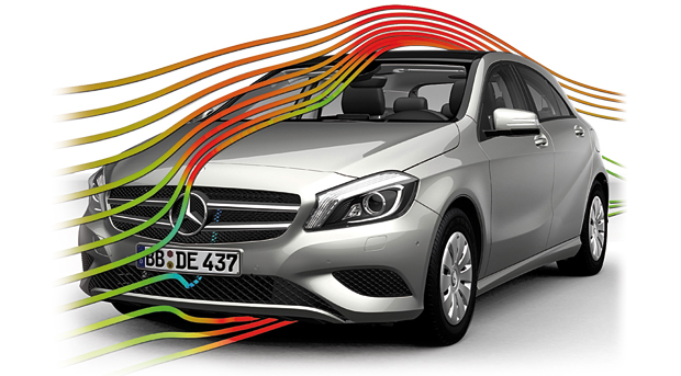 Estes são lugares propícios ao surgimento de turbulência que dificulta o deslocamento do veículo. Pensando em canalizar o ar nessa região, a Mercedes dotou o hatch Classe A de uma peça plástica, que trabalha como um spoiler, na parte inferior do carro, organizando o fluxo próximo às rodas. A marca não informa a contribuição aerodinâmica isolada desse recurso.