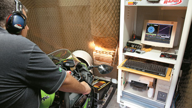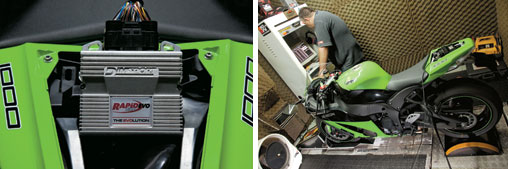 Escolhemos como cobaia desta avaliação a Kawasaki ZX-10R Ninja – a superbike do momento, com cerca de 200 cv declarados. Instalamos os módulos Rapid Evo e Racing, e a moto subiu no dinamômetro com o módulo original e, em seguida, com cada um dos módulos programáveis.