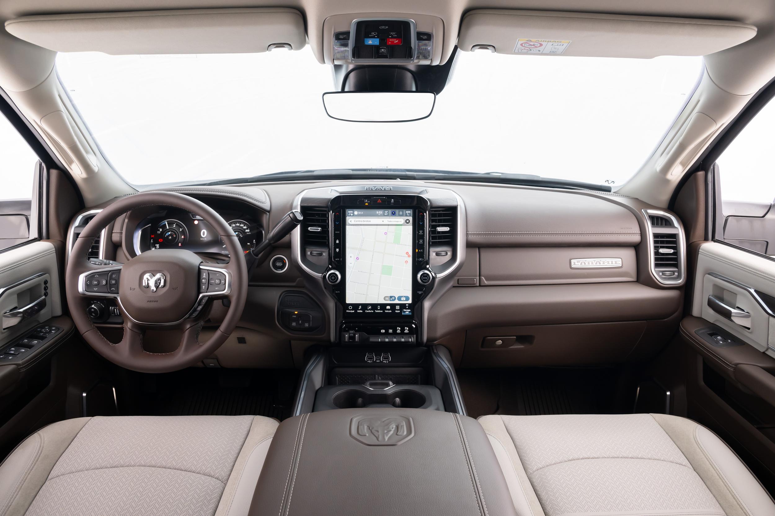 Por dentro, as Ram 2500 Laramie têm acabamento marrom e bege, enquanto as 3500 Longhorn têm interior de couro marrom com pequenas partes de tecido e com filigranas com estilo country e até fivelas metálicas decorando os bolsos atrás dos bancos dianteiros.