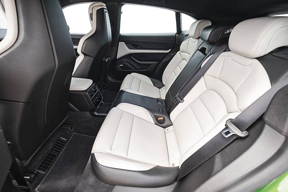 Na dianteira, o maior desafio está no vão de acesso, como no Taycan convencional. O painel, inclusive, é o mesmo com quadro de instrumentos em uma tela curva, uma outra tela para ajudar a operar o ar-condicionado e monitorar a bateria, e de uma terceira para a central multimídia.