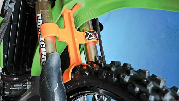 Apoiando-se sob o para-lama dianteiro e em cima do pneu dianteiro, o suporte impede o fechamento completo da suspensão, reduzindo a possibilidade de danos a retentores (que causam vazamentos) e molas internas. É um recurso barato e bem útil para o transporte frequente ou prolongado de motos off-road.