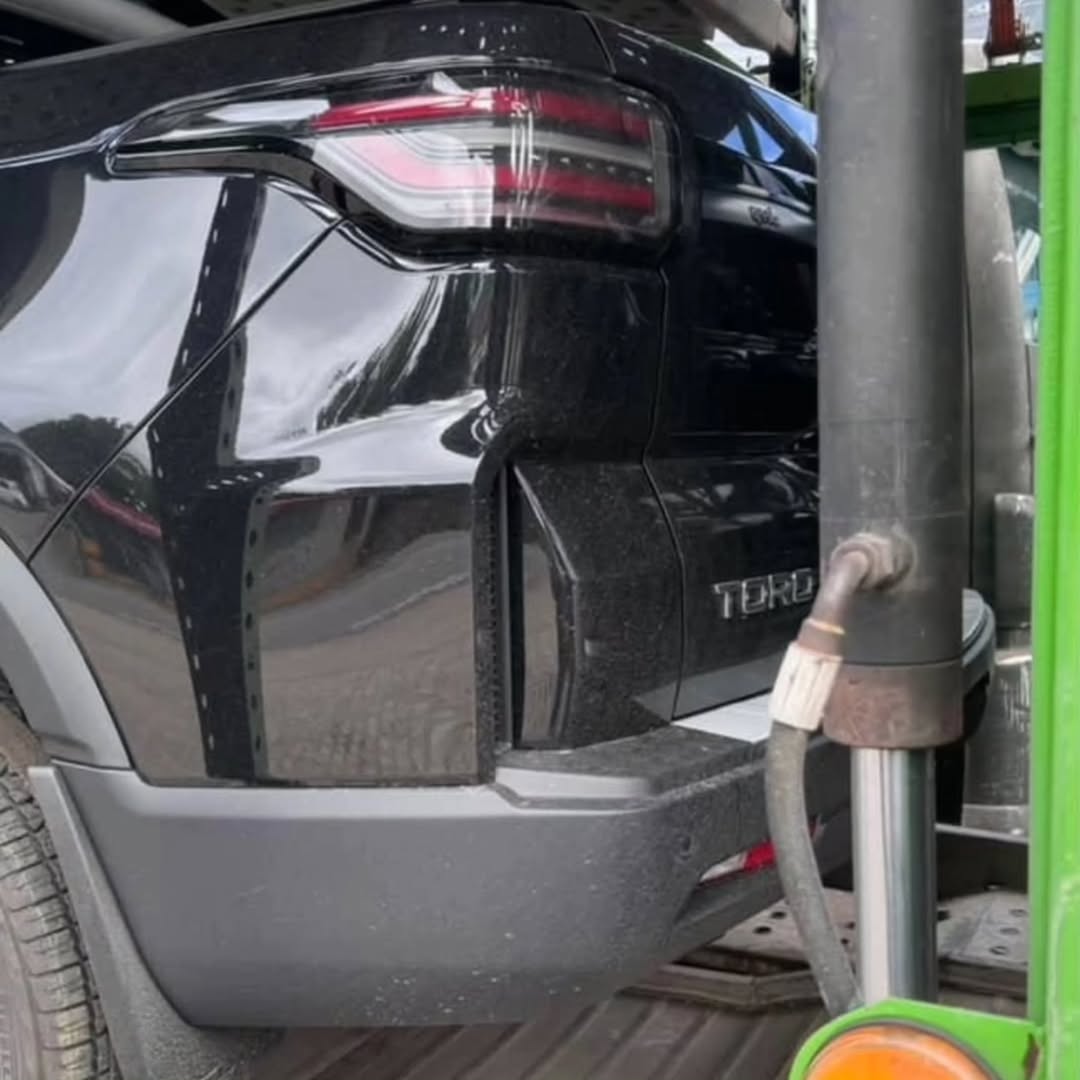 Logo abaixo, na tampa da caçamba, está uma área elevada perto do para-choque. É uma peça que causa estranheza, ainda mais olhando de lado. Aparenta ser uma modificação feita para aumentar o espaço perto do assoalho em alguns centímetros. Tanto a frente quanto a traseira estão com imitações de passagens de ar nas extremidades.