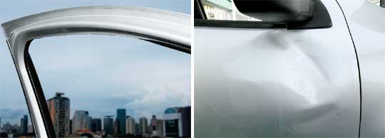 A guarnição superior da canaleta da porta do motorista se deslocou com o movimento do vidro (esq.). A porta foi atingida por uma moto. Os primeiros orçamentos ficaram entre 1531 e 1817 reais (dir.).