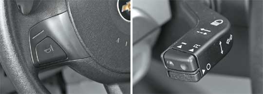 Teclas pequenas dificultam o acionamento da buzina em situações de emergência (esq.). Piloto automático: botões na alavanca são duros e provocam acionamento acidental do farol alto (dir.).