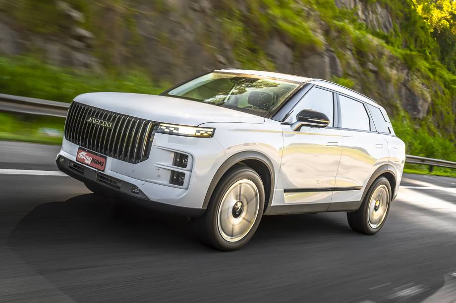A clara inspiração nos carros da Range Rover confere ao Jaecoo 7 linhas mais retas e limpas, com cromados apenas nos filetes verticais na enorme grade de aspecto quadrado. Por outro lado, o que o carro tem de original acaba sendo ofuscado.