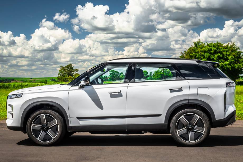 Visto de perfil, o Jaecoo 7 também tem maçanetas retráteis e teto flutuante, porque todas as colunas são pretas. E ainda tem o vinco que começa nas luzes de leds mas se dissipa nas portas traseiras – no Velar, o vinco vai até as lanternas traseiras. As rodas são aro 19 e têm capas com função aerodinâmica.