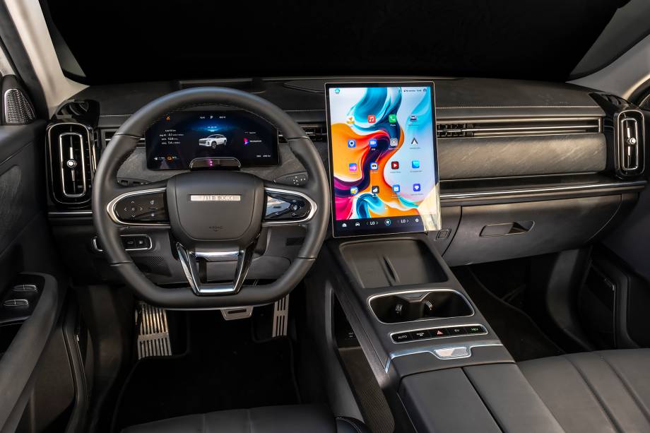A cabine do Jaecoo 7 até foge ao normal dos carros chineses, mas ainda têm referências aos Range Rover. São as saídas de ar-condicionado disfarçadas entre as aletas que vão de ponta a ponta do painel e o miolo do volante, idêntico ao de um Range Rover. Mas o painel é mais vertical, é predominantemente preto e a faixa central tem um plástico com aspecto e textura que imita mármore bruto. É interessante e também está nas portas.