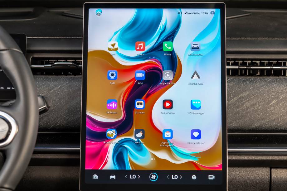 A central multimídia é representada pela tela de 14,8″ vertical. É mais larga e muito mais funcional que outras telas verticais.
