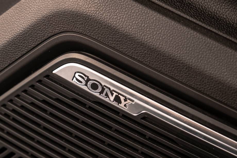 Toda a parte superior do painel e das quatro portas têm revestimento macio e de boa qualidade. Os puxadores ainda têm um material sintético mais áspero, que lembra nobuck, de bom aspecto. O console tem porta-copos, um outro compartimento na parte inferior e, também, dentro do apoio de braços – com direito a refrigeração. Ainda tem uma base de carregamento sem fio no console.