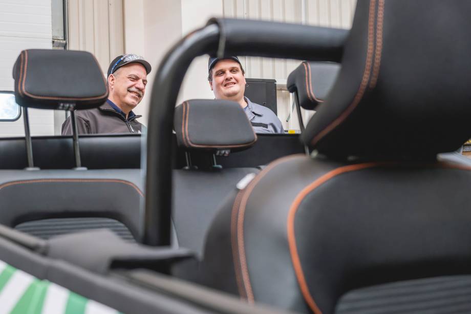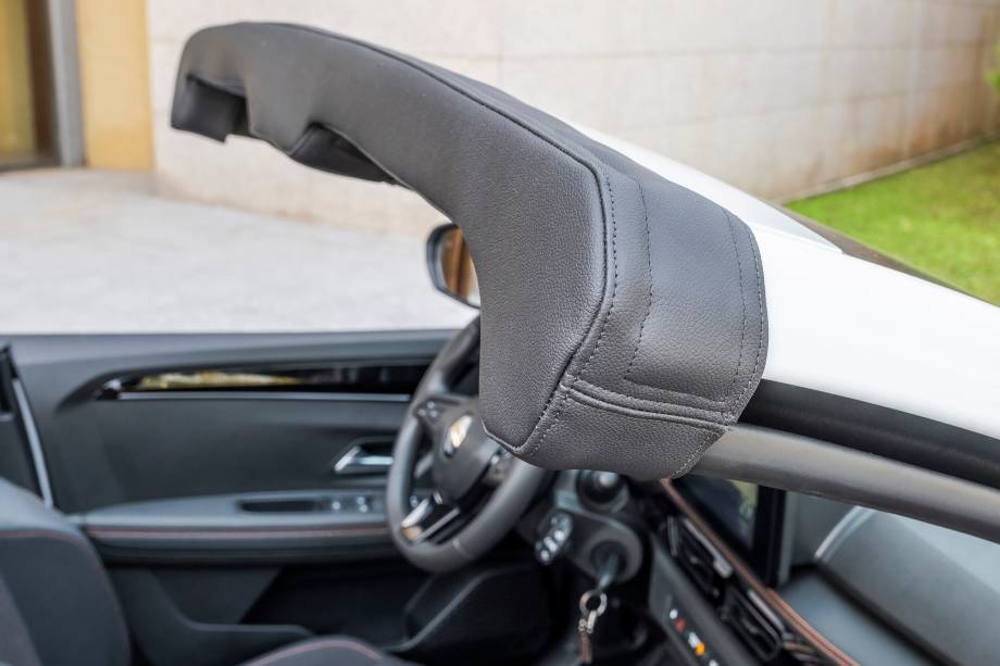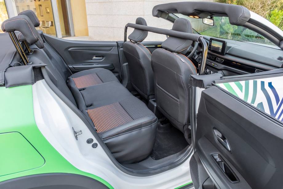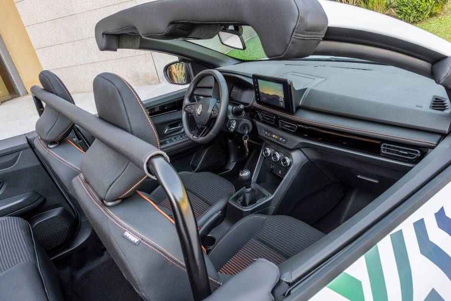 Era a hora de uma outra equipe entrar em ação para fazer os acabamentos. Sem a parte superior, com o vidro, a tampa do porta-malas foi inutilizada e recebeu uma estrutura e acabamento por cima: um vinil que, na verdade, é a capota marítima de uma Renault Oroch. O mesmo material foi usado para revestir os pontos que foram cortados na carroceria, inclusive a borda da moldura do para-brisa.
