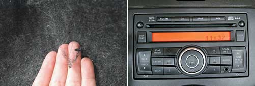 O carpete do assoalho desfia mesmo em regiões onde os pés não entram em contato (esq.) | O rádio é compatível com iPod e tem entrada auxiliar, mas não conta com USB e Bluetooth (dir.)
