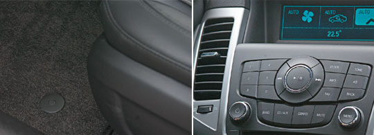 Segurança para baixo do tapete: botões de pressão mantêm as peças dianteiras no lugar (esq.) | Ar-condicionado temperamental: quando o dia estava quente, não resfriava a cabine (dir.)